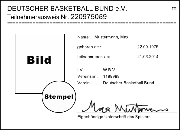 Ein gültiger TNA verfügt über ein erkennbares Foto des Spielers, ein Vereinsstempel und natürlich über die Unterschrift des Spielers. Ablesen kann man die TNA-Nummer (220975089), die aus dem Geburtsdatum und einer dreistelligen Prüfziffer besteht. Zudem ist das Geschlecht der Spielerin / des Spielers notiert (oben rechts: w = weiblich; m = männlich). Das Ausstellungsdatum (21.03.2014) gibt an, wann der TNA beantragt wurde. Zudem sind der zuständige Landesverband, die Vereinzkennziffer und der Vereinsname vermerkt.